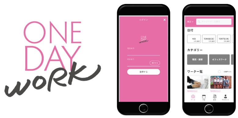 ワンデイワークとは「単日・短時間で働きたい人」と「もっと柔軟に人材確保を行いたい雇用主」をインターネット・アプリ上でつなぐ、求人情報・求職者情報提供のプラットフォームだ。このサービスは、求人検索・申し込み・求職者募集・契約書締結・給与の支払い(受け取り)などの手続きがアプリ上で完結する仕組みである。「働く側」「雇用する側」双方のネックになっていた手続きをプラットフォーム上にまとめることで、単日・短時間という単位で働く/雇用することが可能になる。