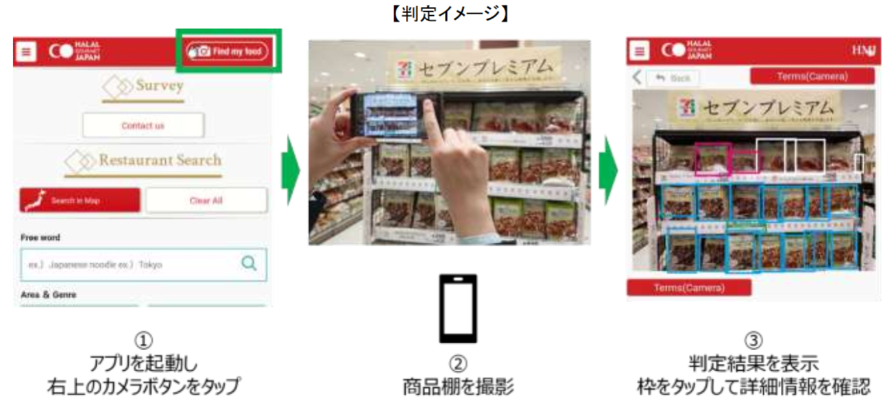 食品判定システムとは、お客が専用のアプリを使って、店舗内の商品棚をスマートフォンで撮影すると、ムスリムやヴィーガンが食べることができる商品かどうか、アプリが判断材料となる情報を提供するシステムだ。