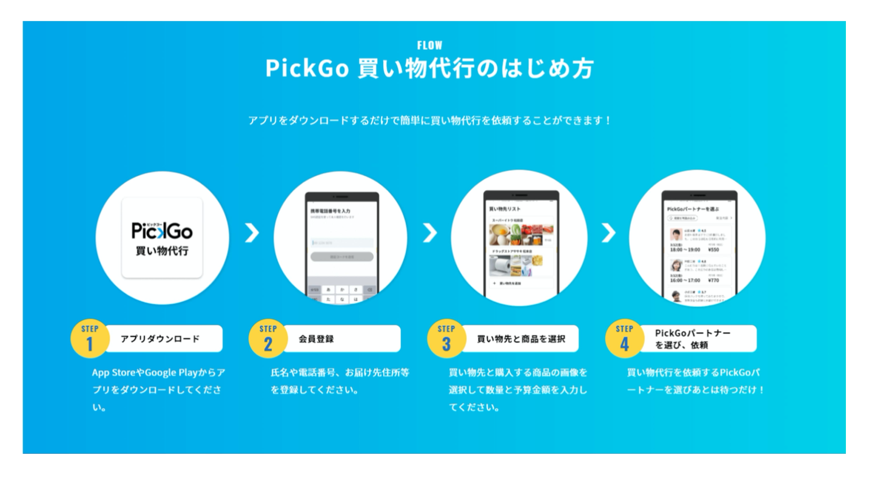 「PickGo 買い物代行」サービスは、自宅や外出先からスマートフォンのアプリ上で、買い物先と購入商品を入力することで、自宅または指定場所まで、プロのドライバーが24時間、いつでも商品を届けるサービスだ。最短1時間以内に商品を受け取ることが可能となる。