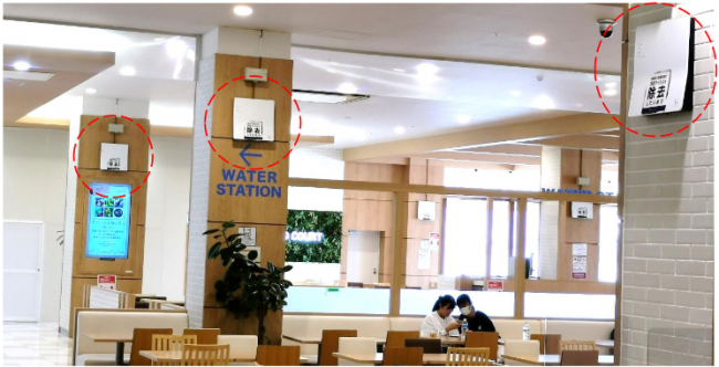 導入店舗は、イオンタウンおゆみ野(千葉県千葉市)、イオンタウン姶良(鹿児島県姶良市)の2店舗。イオンタウンおゆみ野ではフードコート、授乳室、1階南側入口横男性用トイレに壁掛け式15台、電球式3台を設置する。イオンタウン姶良は壁掛け式をフードコート、授乳室などに29台、電球式を3台設置する。