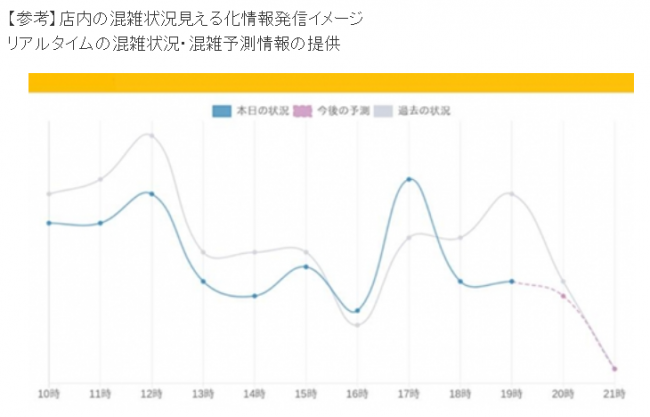 IoTセンサーを活用して売場、テナントの混雑時間帯や混雑箇所を特定し、それらを回避をする安心・安全な店舗運営の実現を目指す。