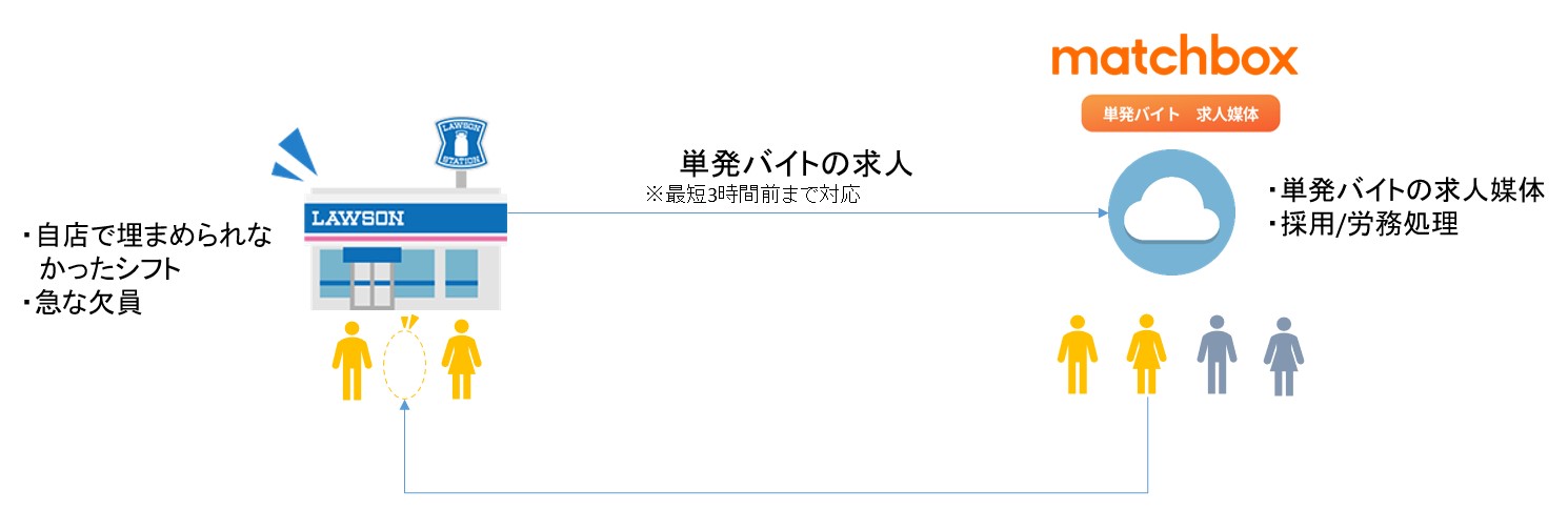 マッチボックスはグループ会社のローソンスタッフ(株)(新潟県新潟市)が提供するサービスで、店舗側が就労時間の3時間前までに求人を行い、登録している求職者が自身の条件に合った店舗に応募、店舗側が人財を選択する仕組み。