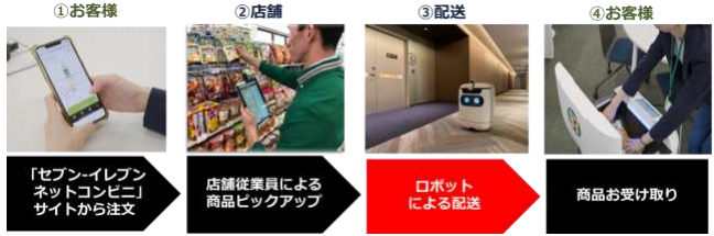 3社は、ソフトバンクの社員が「セブン‐イレブンネットコンビニ」で注文した商品を、東京ポートシティ竹芝オフィスタワー内のセブン‐イレブン店舗から同じフロアの指定された場所まで、アスラテック社のロボット「RICE」を使って配送する実証実験を1 月18日(月)から試験的に行ってきた。セブン‐イレブンネットコンビニはセブン‐イレブンの商品をスマートフォンで注文し、指定した場所で受け取れるサービス。