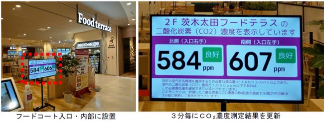 イオンタウン(株)(千葉市美浜区、加藤久誠社長)は、コロナ下でもより「安全・安心」な買物環境を提供するため、「イオンタウンふじみ野」(埼玉県ふじみ野市)と「イオンタウン茨木太田」(大阪府茨木市)に、顧客自身が換気状況を確認できる「CO2濃度モニター」を設置した。