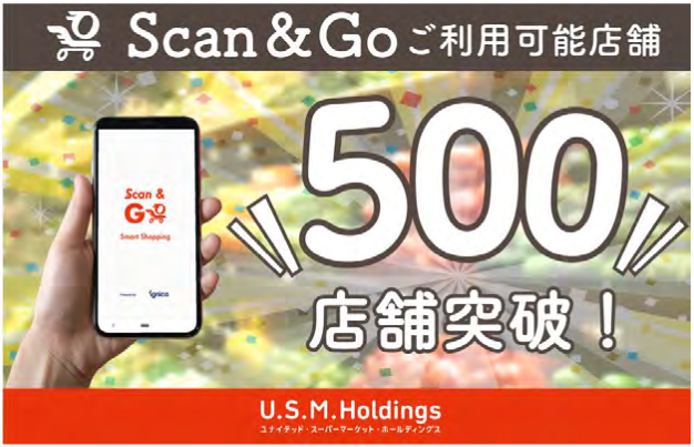 ユナイテッド・スーパーマーケット・ホールディングス(株) (東京都千代田区、藤田元宏社長、略称U.S.M.H)は、スマートフォン決済できるU.S.M.H公式モバイルアプリ「Scan&Go Ignica(スキャン・アンド・ゴー・イグニカ)」の利用可能店舗が、8月20日(金)マックスバリュエクスプレス市川店への導入をもって、500店舗に到達したことを発表した。