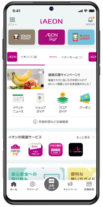 「iAEON」は、「WAON POINT」の利用・付与・照会・交換ができるほか、電子マネーやコード決済での支払い、「お気に入り店舗」のキャンペーン情報の確認ができるなど、グループ各社が提供するサービスをまとめて一つのアプリで利用が可能になる。