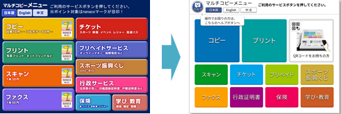 マルチコピー機を初めて使う人でも迷わずに操作ができるよう、従来の操作画面を見直し、スマートフォンやタブレット端末に近いデザインに刷新した。また、コピー機本体の高さを低くし、操作画面の角度を最適化するなど、車いすの人でも「あんしん」して利用できるデザインに変更した。