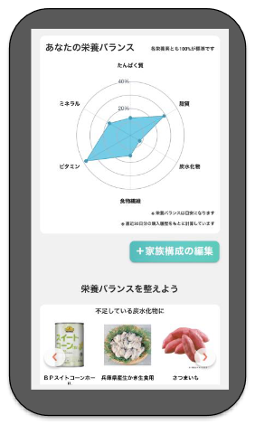 アプリには直近30日間の購入商品の栄養バランスがグラフ化されるため、購入商品の栄養素の過不足が把握できる。栄養バランスは炭水化物、たんぱく質などの5大栄養素に食物繊維を加えた6つの指標になる。この栄養バランスの結果をもとに、不足している栄養素を補う商品をレコメンドしたり、旬や季節を考慮したお勧め商品を提案したりと、アプリによる推奨販売につなげていく。