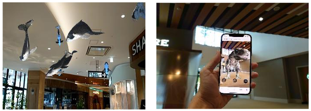 同施設1階の3カ所、2階の2カ所、6階(BIZriumフロア)の1カ所、合計6カ所に体験エリアが設けられる。イオンモールアプリ内の「バーチャルな世界(AR)を 楽しもう!!」をタップし、スマートフォンをかざすと、体験エリアごとに「動物園」「キャラクター」「水族館」「ショップ情報」など、さまざまなARコンテンツを見ることができる。