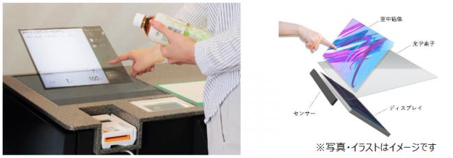 空中ディスプレイは、ホテルやオフィスとなどの受付機、デジタルサイネージなどを中心に展開されている。レジ画面を空中に結像し、空中に浮かんだ映像をタッチパネルと同様に操作するというもので、①ディスプレイ、②光学素子(空中ディスプレイプレート)、③センサーの各モジュールで構成される。この技術をPOSレジに採用した実証実験は世界初だと言う。