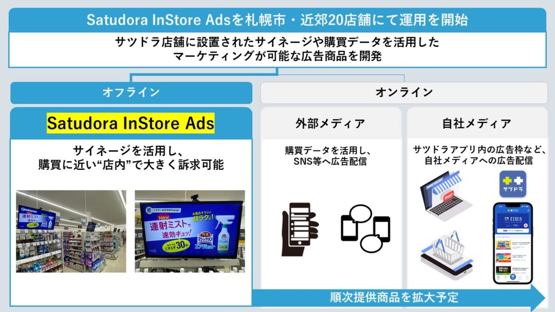 この「リテールコネクト」の一機能として、同社の購買データやサイネージを活用した販促メディア「Satudora InStore Ads」を共同開発し、サツドラ20店舗でスタートした。