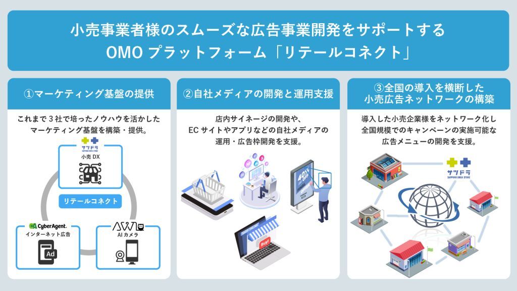 同サービスの特徴として、3社で培った小売における広告事業創出のノウハウを活かしたマーケティング基盤を構築・提供し、各社に合わせた広告事業の創出を支援するためのパッケージを開発する。
