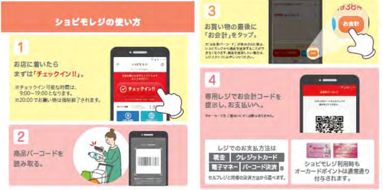 「ショピモレジ」はお客のスマホで商品のバーコードの読み取りを行い、会計機では精算のみを行うというもの。レジでの待ち時間が短縮され、非接触での支払いが可能になる。