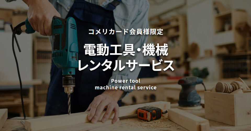電動工具のレンタルサービスは、コメリカード会員を限定に、大型店を中心に実施している。仕事先で急遽必要になった場合や、DIYで1日だけ使いたい場合など、DIYからプロユースにまで応える。
