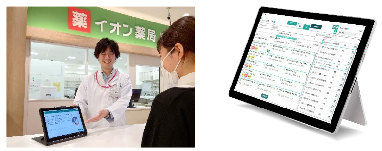 Musubi は、お客と薬剤師の意思疎通をより良く変える次世代型の業務支援サービス。Musubi のタブレット端末をお客と一緒に見ながら服薬指導し、その場の画面タッチで薬歴のドラフトを自動で作成できる。さらにお客の健康状態や生活習慣にあわせたアドバイスを提示できる。イオンに薬局では導入によって1人ひとりにあった服薬指導、健康アドバイスを行い、一方で、薬剤服用歴作成等の業務と調剤業務フローを効率化して、お客の待ち時間短縮を目指していく。