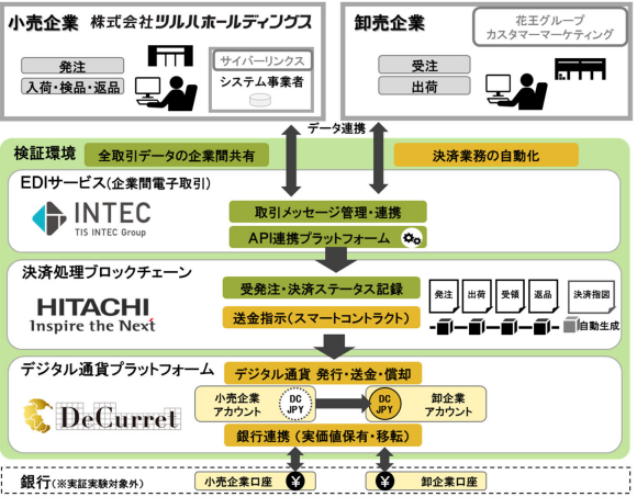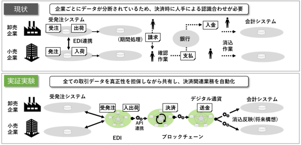 同実証実験を通じ、企業間での受発注から支払いまでの一連の商取引にブロックチェーンを使ってデータの真正性を担保しながらシステム上で完結し、サプライチェーンに関わる業務の効率化、高度化に向けた効果検証を行う。