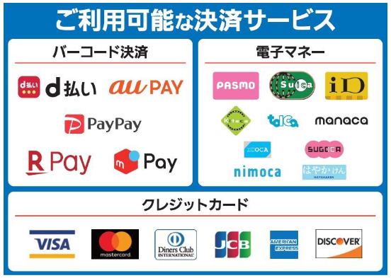 同社では、これまで PayPayを導入していた。PayPayでは店舗側が用意したQRコードを顧客がスマートフォンで読み取り、金額を入力する方式(ユーザースキャン方式)だったが、新システムを導入することによって、お客様のスマートフォンに表示されたバーコードを店舗側が読み取る方式(ストアスキャン方式)に変更する。これによって決済までの時間を短縮することができる。また新システムの導入を機に新たに4種類を追加している。