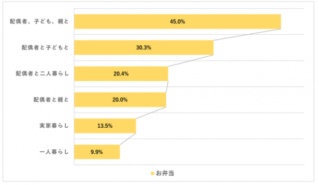 ■頻出ワードであった「お弁当」について、家族構成別で見ると、「配偶者、子ども、親と」が45.0%、「配偶者と子どもと」が30.3%と、当然ながら子持ちの家庭での割合が高い。