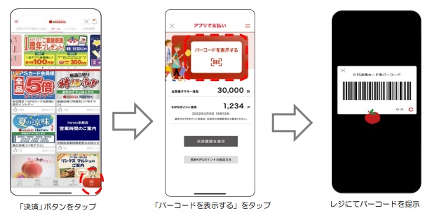 近商電子マネー機能付きポイントカード「KIPS 近商カード」をアプリに連携し、アプリにバーコードを提示することで、KIPSポイントや電子マネーの利用が可能となる。現金での支払い時でも、ポイントカードとしてアプリを利用することもできる。