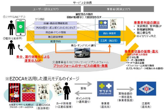 2022年2月に令和3年度事業を行い、サツドラが発行する独自のポイントカード「江差EZOCA」を使って、地域の公共交通サービスを活用とサツドラグループの店舗はじめ地域の商業施設での利用を促し、そこで得られたデータをもとに収益事業モデルとして確立を目指す。「江差EZOCA」は購入金額の一部(0.2%)が江差町に還元される地域応援型ポイントカード。