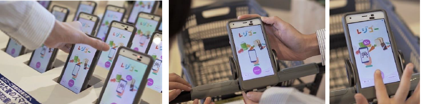■「レジゴー」の流れ①店舗入口付近で専用スマホを手に取る。カートを利用する場合は、スマホホルダーにセットする。