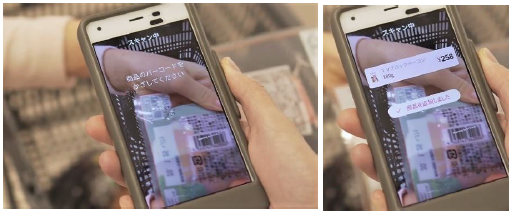 ③専用スマホのカメラで購入する商品のバーコードをスキャンする。野菜や果物などバーコードが付いていない商品は、POPのバーコードをスキャンするか、画面上のタッチパネルで商品を選択する。