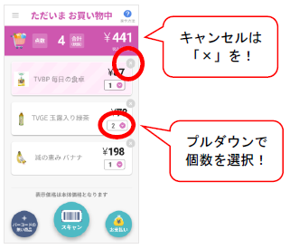 ④スキャンすると、画面上に商品が追加される。購入商品は一覧として確認できるため、買い忘れ防止にもつながる。複数点数買う場合は、画面上のプルダウンで個数を選択し、キャンセルする場合は「×」を押す。