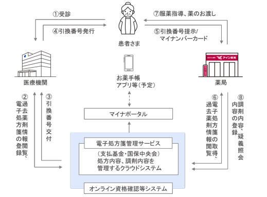 患者の同意があれば、複数の医療機関、薬局間で薬剤情報を共有することができる。これにより過去の服薬情報に基づいた服薬指導、重複投薬の防止が可能となり、より安心、安全に薬を服用できる。また、顔認証付きカードリーダーを利用したオンライン資格確認とあわせて利用することで、健康保険等の資格確認もスムーズになる。