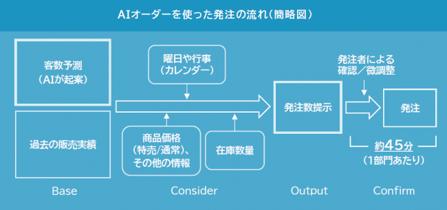 「AIオーダー」は、客数と商品の需要予測をもとに最適な発注数を提示するシステム。正確な発注数を自動で提示し、発注時間を平均で5割削減する。