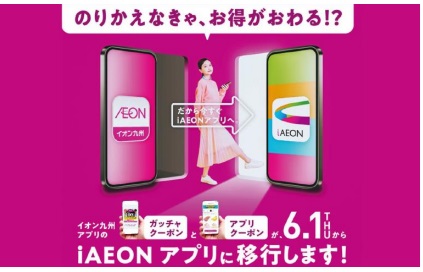 イオン九州(株)(福岡市博多区、柴田祐司社長)は、イオン九州アプリ内で配信している「ガッチャクーポン」「アプリクーポン」の配信を5月31日(水)で終了し、イオングループの公式トータルアプリ「iAEON」(アイイオン)でのクーポン配信を、6月1日(木)から開始する。