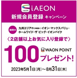 iAEONアプリ 新規登録キャンペーンとして、8月31日(木)まで、「iAEON」アプリを新規ダウンロードとカード登録の上、お気に入り店舗に九州エリアの店舗を2店舗以上を登録した顧客に、100WAON POINT をプレゼントする。対象店舗は、九州内のイオン・マックスバリュ・ホームワイド・ザ・ビッグ・イオンバイク。