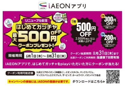 また、6月1日(木)から8月31日(木)まで、「iAEON」で“はじめてガッチャ”を利用した顧客限定で最大500円オフのクーポンが当たる。対象店舗は、九州内のイオン・イオンスタイル・マックスバリュ・マックスバリュエクスプレス・ザ・ビッグ、ザ・ビッグエクスプレス、ホームワイド、イオンバイク。