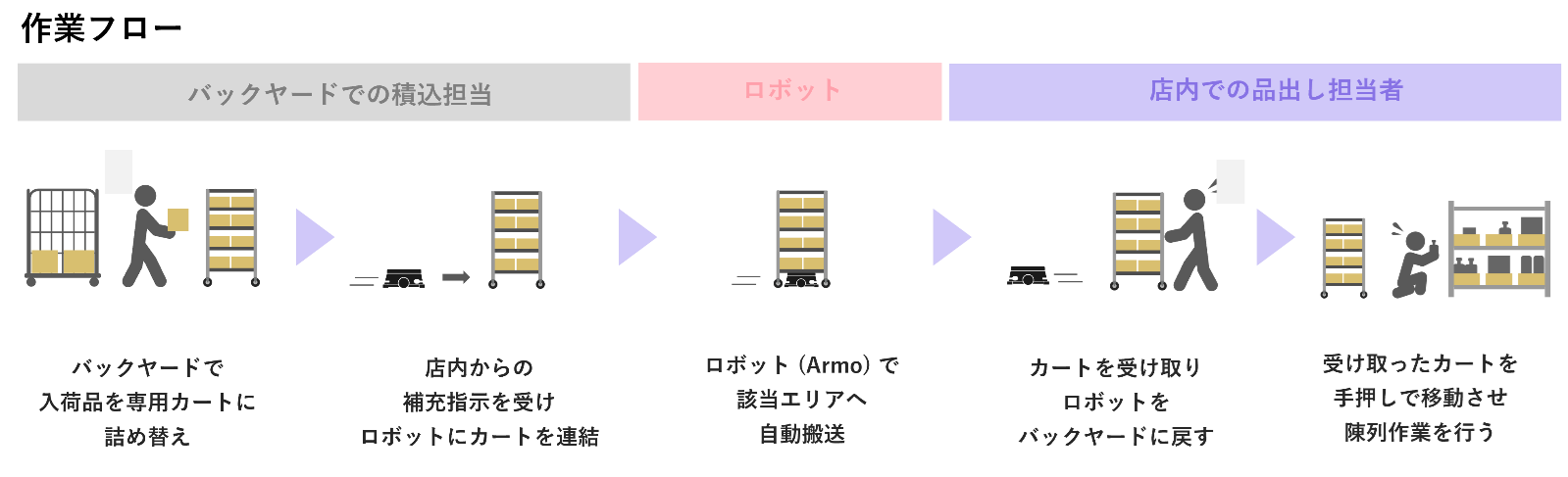 小売企業は人手不足や人件費の高騰の影響を受けて、店舗内の品出し作業などの省人化ニーズが高まっている。Armoを活用したオペレーションでは、バックヤードから売場までの搬送作業は自動化される。ただしバックヤードでの商品の積み替え作業や店内での陳列作業はスタッフが行う。