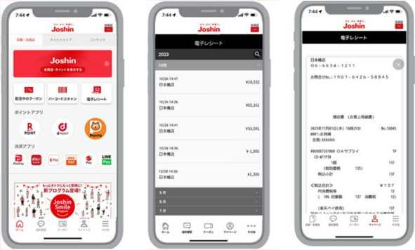 ジョーシンカード会員は「ジョーシンアプリ」を通じて、顧客自身のスマートフォン上で電子レシートを受け取ることができる。店舗での買物履歴および買物明細を過去10年間分、表示することができるようになる。