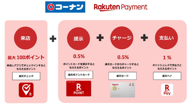 利用者は店内の指定エリアで「楽天チェック」アプリを起動しチェックインすると、くじ形式で「楽天ポイント」を最大100ポイント獲得することができるようになる。コーナン商事は、対象店舗でスマホ決済サービス「楽天ペイ(アプリ決済)」、共通ポイントサービス「楽天ポイントカード」を導入するなど楽天グループとの連携を進めてきている。