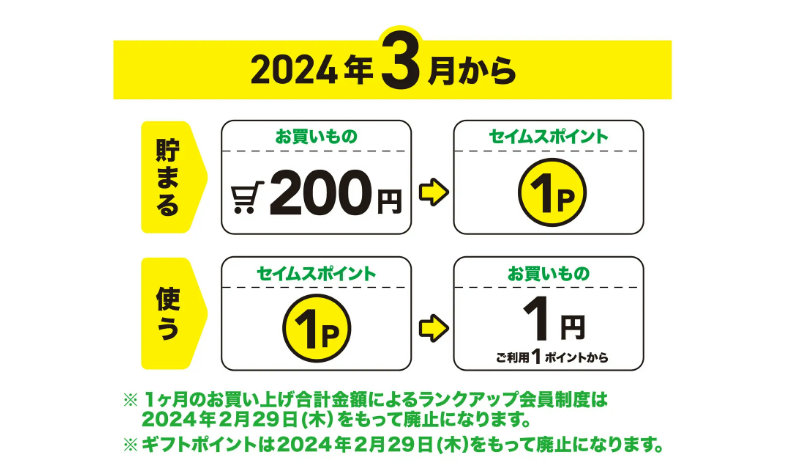 「セイムスポイント」とは、200円(税別)の買い物で1ポイント貯まり(1ポイント=1円相当)、支払い時に1ポイントから使用できるポイントプログラムで、より使い勝手の良いポイントサービスへと生まれ変わる。