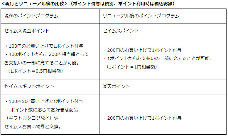 また、春からは「楽天ポイントカード」を導入し、店舗でのお支払い時に「楽天ポイントカード」または「楽天ポイントカード」機能が搭載されたアプリを提示すると、金額に応じて「楽天ポイント」を貯めることができる。セイムスで貯めた「楽天ポイント」でも保有している「楽天ポイント」でも支払い時に利用することが可能になる。