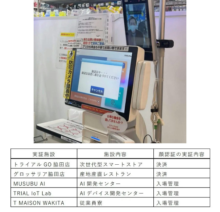 協業の第一弾として、トライアルが運営する福岡県宮若市の複数施設で、トライアル、NEC、およびトライアルの取引先企業の約500名を対象に、NECの世界No.1の認証精度(米国国立標準技術研究所(NIST)による顔認証ベンチマークテストでこれまでにNo.1を複数回獲得)を有する顔認証技術を活用した決済と入場管理の実証を、1月末から2月中旬にかけて順次開始する。