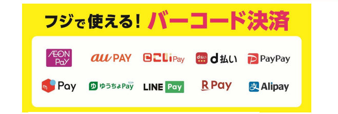 フジは、2020年6月から顧客の利便性の向上を図るため、各種バーコード決済を開始。これまで「au PAY」「こい Pay」「d払いⓇ」「PayPay」「メルペイ」「ゆうちょPay」「LINE Pay」「楽天ペイ」「Alipay」の9種類のバーコード決済を導入してきた。今回、10種類目となる「AEON Pay」サービスを導入する。