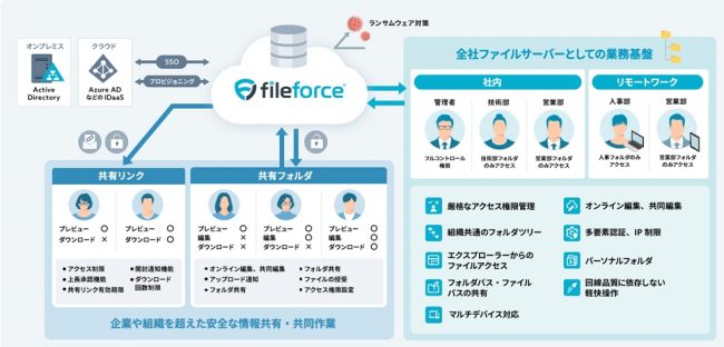 ファイルフォースでは従来のオンプレミスのファイルサーバーやNASの使いやすさやアクセス権限などの運用を変えずに、安全なファイル編集やファイル共有機能をユーザー数無制限で提供する法人向けサービスとなっている。ヤオコーでは共同編集ファイルの送付削減時間は1カ月1人当たり32分(1回1分×8回×4ベンダー)、操作解析時間は1回当たり5分の短縮効果が得られた。