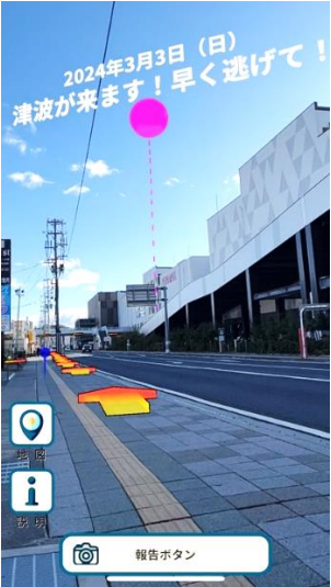 「避難を支援するスマホアプリ」は実空間に情報を付与する実空間メタバースを、カメラに写った画像から正確にカメラの位置や向きを特定するVisual Positioning Systemによって実現し、スマホアプリとして提供する。アプリには「津波が来ます!早く逃げて!」という文字とともに避難経路が矢印で示される。