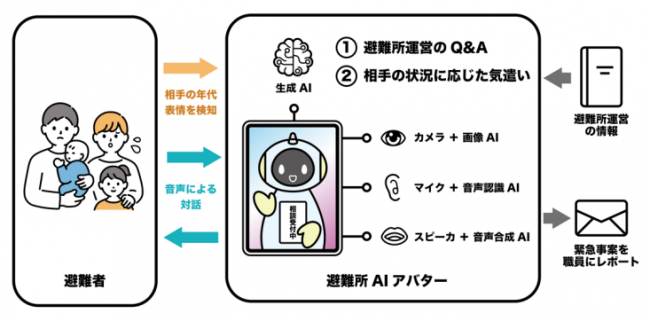 「避難所をサポートするAIアバター」は、避難者や避難所の運営をサポートするため、あらかじめ多くの知識を習得させた対話可能のAIアバターを大規模言語モデルによる生成AIで構築した。避難所AIアバターは、カメラと画像AIで、相談したい避難者の年代や表情を検知する。そしてマイクと音声認識AIやスピーカーと音声合成AIをつかって、避難者と音声による対話を行う。