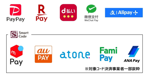 利用可能なバーコード決済は、PayPay、楽天ペイ、d払い®、WeChat Pay、Alipay、そしてSmart Code™に対応するメルペイ、au PAY、atone、FamiPay、ANA Payなど。