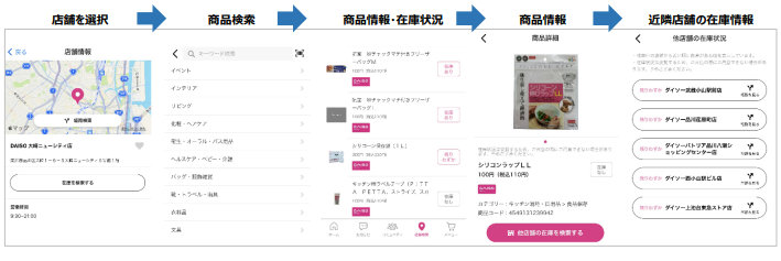 「DAISOアプリ」は、公式ECサイト「ダイソーネットストア」、ファンコミュニティサイト「DAISO の輪」へアクセスでき、さらに店舗の在庫状況が手元で確認できる。同アプリの導入で、「探している商品が最寄りの店舗にあるか知りたい」「多くの商品の中からおすすめを知らせてほしい」「ネットストアで買いたい」という顧客の要望に応えていく。
