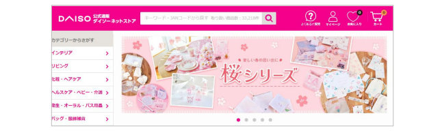 「ダイソーネットストア」を選択しログインすると、手軽にアクセスできる。衛生用品やコスメ、モバイル、趣味のグッズ、いざというときに備えておきたい防災用品など、約3万点の商品を取り揃える。商品を1個単位で、合計金額1100円(税込み)から注文可能。
