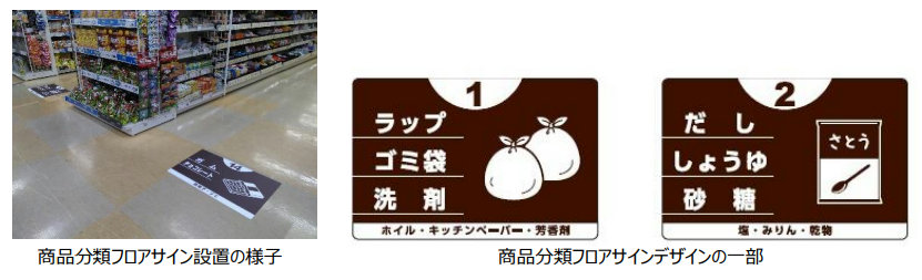 今回、認知症の方をはじめ、高齢の方から子どもまで、誰にでも分かりやすい店内表示として商品分類フロアサインを設置した。現状、設置している商品分類の表示案内は、天井などから吊るされているものが多く、鈴鹿市認知症連絡会から床面表示の希望が多いとの提案から、今回フロアサインを試験導入することになった。