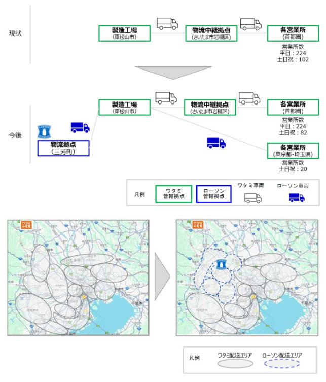 シェアリングの仕組みは、「ワタミの宅食」の物量が減る土日祝日に、埼玉県三芳町を物流拠点としているローソン車両の非稼働時間を利用し、「ワタミの宅食」の商品を埼玉県東松山市の製造工場から東京都・埼玉県の営業所約20カ所へ配送するというもの。今後は、2024年度中を目途に順次エリアの拡大を目指していく。