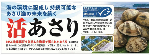 今回、MSC漁業認証を取得した漁業で獲られた中国産のあさりを、国内の「MSC CoC認証」(MSC認証水産物が非認証水産物と混ざらないことを目的とした、水揚げ以降のサプライチェーンに対する加工・流通の管理認証)を取得した保管場所に、生きたまま選別・保管する「活かし込み」をすることで、安定的な供給体制を整え、日本初のMSC認証中国産「活」あさりの販売が可能になった。