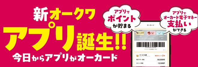 新しいオークワアプリはポイントカード「オーカード」の機能を搭載する。これにより「ポイントを貯める」、 「オーカード電子マネー支払い」、「買物履歴の確認」、「オーカード新規入会」がスマホからできるようになる。また、値引・割引クーポンの配信、チラシ情報、店舗情報などの従来の機能も引き続き搭載する。