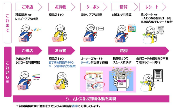 2024年9月以降に、イオンのトータルアプリ「iAEON」に「レジゴー」を組み込む予定。アプリ上でレジゴーを起動できることで、「iAEON」に登録されているオーナーズカードが自動適用され、買上内容は電子レシートとして保管することができるようになる。また、購買履歴や会員情報に合わせたおすすめ商品やキャンペーン情報の提案、クーポンの自動適用も予定している。